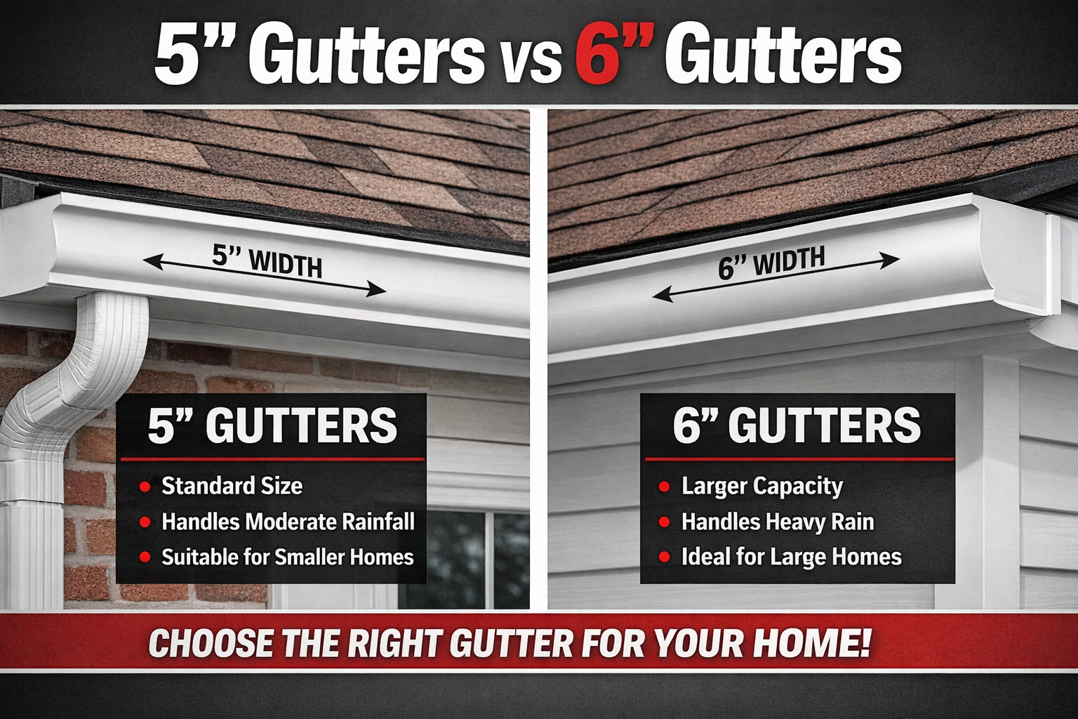 Most standard homes perform well with 5-inch seamless gutters, while 6-inch gutters are recommended for larger roofs, steep rooflines, heavy rainfall areas, or homes with frequent overflow issues. A professional gutter assessment ensures the right gutter size is selected for proper water flow and long-term protection.